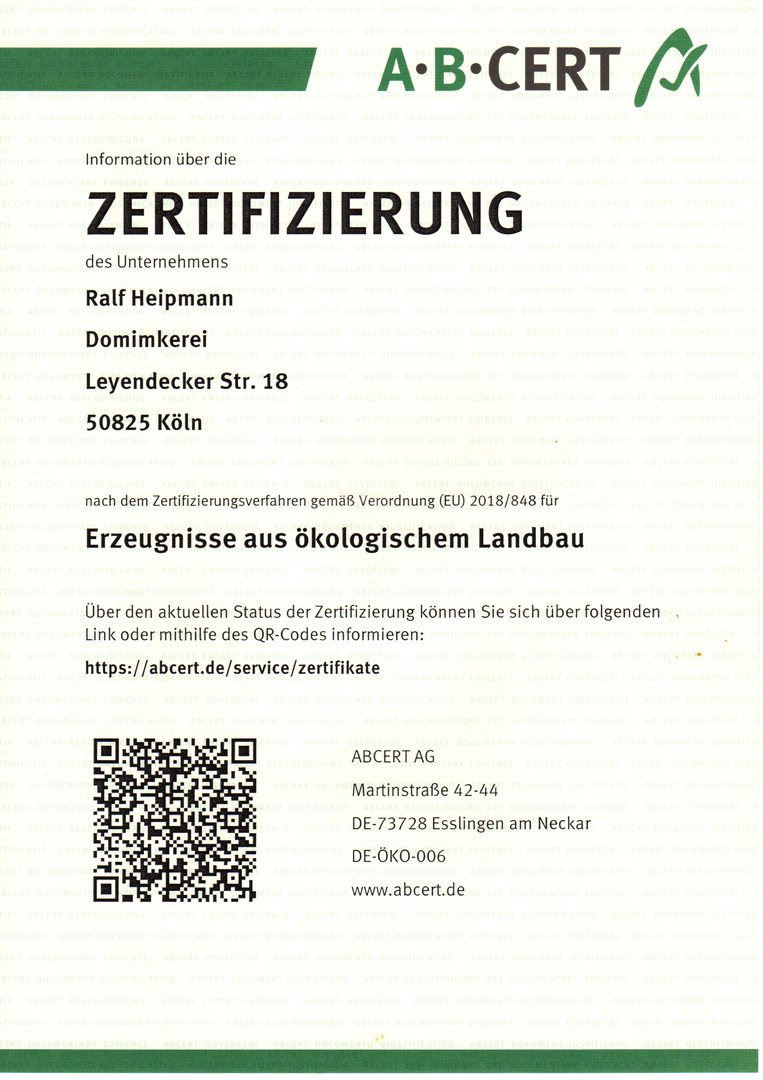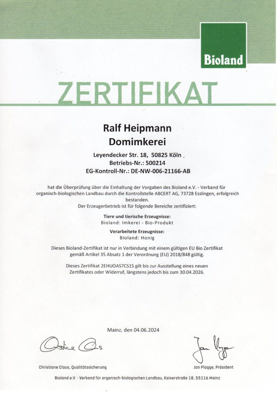 Seit 2014 ist die Domimkerei bei Bioland zertifiziert. Die Kontrollstelle ist ABCERT.